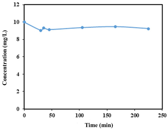 A control test was conducted in the dark using the most active chloride sample, in particular, the 2S (3) impregnation with metal chlorides (Figure 10). The catalyst showed no catalytic activity in the dark, and the decrease in AMX concentration was limited to adsorption during the first 30 min (6% adsorption of AMX on the catalyst surface). Therefore, no catalytic activity was observed in the dark.