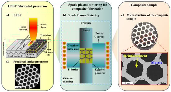 Schematic illustration of the composite manufacturing process: (a1) additive manufacturing of the lattice using LPBF process, (a2) fabricated metal lattice precursor, (b1) spark plasma sintering of the composite by placing the precursor inside the spark plasma sintering mold, and (c1) structure of the fabricated metallic bimetal.
