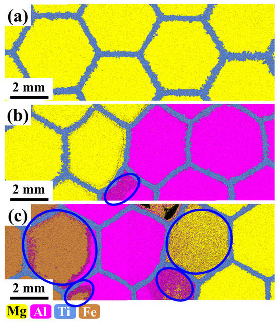 Figure 2 shows the SEM–EDS maps of the metallic multimaterials (Ti6Al4V–Mg—bimetal, Ti6Al4V–Mg–Al—trimetal, and Ti6Al4V–Mg–Al–Fe—MMM). It can be observed from Figure 2a—Ti6Al4V–Mg MMM composite that the Ti6Al4V matrix lattice is not distorted and almost maintains its structure/dimensions after the SPS process. The Mg reinforcement is sintered and shows a distinct interface with the matrix. However, no interfacial reaction between the matrix (Ti) and the reinforcement (Mg) may be observed. On the other hand, in the case of the Ti6Al4V–Mg–Al MMM composite (where two reinforcements Mg and Al are added to the Ti6Al4V matrix) (Figure 2b), both Al and Mg reinforcements are sintered without introducing porosity and maintain a good interface with the lattice. No material reaction is observed at the matrix–reinforcement interface (from Figure 2b). In addition, both the reinforcements are distributed evenly except at the boundary, where there is a mixture of both Mg and Al (as marked in Figure 2b). This mixing of Al and Mg may have happened during the addition of the reinforcement powders to the Ti6Al4V lattice precursor. The Ti6Al4V lattice shows signs of distortion, where the compression of the lattice is observed. In Figure 2c, three different reinforcements (Mg, Al, and Fe) were added to the Ti6Al4V matrix. This MMM composite shows severe lattice distortion like the Ti6Al4V–Mg–Al composite. The reinforcement particles are sintered well, and no visible interfacial reaction is observed between the reinforcement particles and the Ti6Al4V precursor interface. Like the previous counterpart (Ti6Al4V–Mg–Al composite), the mixing of reinforcement powders may be observed near the interface and are marked by blue areas in Figure 2c.