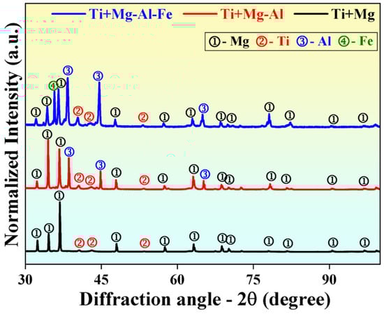 XRD measurements were conducted on these MMM composites to evaluate the reaction between the different reinforcement powders at their interface and the reinforcement–matrix interface. The XRD diffraction patterns of these MMM composites (Ti6Al4V–Mg, Ti6Al4V–Mg–Al, and Ti6Al4V–Mg–Al–Fe) are shown in Figure 3. The Ti6Al4V structure fabricated by LPBF shows the presence of α′-Ti—martensitic microstructure, even though Ti6Al4V is an α + β composition [,,,,,,]. The complex interplay during heat extraction along different directions (including conduction, convection, and radiation) with different rates leads to a complex and anisotropic microstructure in the LPBF-processed materials [,,,]. The diffraction pattern of the Ti6Al4V–Mg MMM shows the diffraction peaks of Mg and α/α′-Ti phases, both showing hcp crystal structure. Thermal energy supplied during the SPS process may partially relax the Ti6Al4V microstructure, where partial transformation of α′ phase to α phase may take place. Hence both α and α′ phases coexist after the SPS process. No additional peaks other than the Mg and α/α′-Ti phases are observed within the deductible limits of the XRD suggesting no interfacial reaction taking place during the fabrication process.