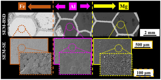Scanning electron microscopy images (both secondary electron (BE) and back-scattered (BSD) modes) showing the microstructure of the Ti6Al4V–Mg–Al–Fe metallic multimaterial composite.