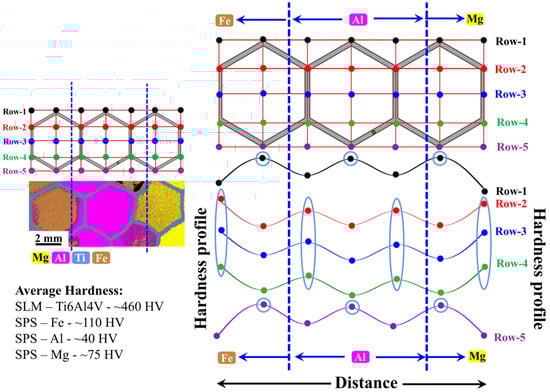 The hardness profile observed for the Ti6Al4V–Mg–Al–Fe MMM composite is shown in Figure 5. Since the LPBF Ti6Al4V results in α′-Ti martensitic microstructure, it offers very high hardness (~480 HV). However, after the SPS process, the hardness relaxes and hardness values of ~460 HV were observed for the Ti6Al4V structure. The reinforcement (since sintered) shows lower hardness than the solidified Ti6Al4V structure. Sintered Fe shows the highest hardness of ~110 HV, Mg showing intermediate hardness (~75 HV), and Al the least hardness (~40 HV). Since the reinforcements and the matrix lattice are placed uniquely, the hardness profile shows variation in a sinusoidal fashion (Figure 5). Such a unique hardness profile can be observed only for the novel MMM composites fabricated by combining both AM and PM processes.