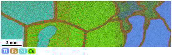 Scanning electron microscopy–energy dispersive spectroscopy area maps showing the individual constituents present in the 316L SS–Ti–Cu–Ni metallic multimaterial composite.