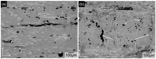 The composite used in this study was fabricated via the Zr-Ti alloy MI. Polyacrylonitrile (PAN)-based carbon-fiber-reinforced carbon matrix (C/C, FS-320, CFC Design, Sabae, Fukui, Japan) cross-ply (0°/90°) laminates with a fiber volume fraction of approximately 20% were used as a preform. In addition, porosity of C/C preform is ~20%. Typical microstructure was shown in Figure 1a,b. The preforms used in the present study are the same as the ones used in a previous study [50].
