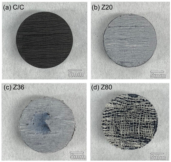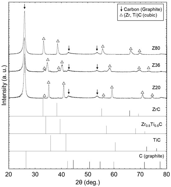 Three types of Zr-Ti alloys with different atomic compositions (Zr:Ti = 20:80, 36:64, and 80:20) were fabricated from Ti and Zr chunks (purity: 97–99%, Kojundo Chemical Laboratory, Co., Ltd., Sakado, Saitama, Japan) using an arc-melting furnace (NEV-ADR03, Nissin Giken Corporation, Iruma, Saitama, Japan). Prior to melting, the evaporation and introduction of Ar (purity: 99.999%) were repeated thrice, and the vacuum level in the chamber was set to −0.06 atm. To achieve uniform microstructures, the melting and solidification of the alloys were repeated four or five times. The Zr-Ti alloys were infiltrated into the C/C using a carbon heater furnace (Iida Kogyo, Model: Heat-treatment furnace for the regeneration and recovery of creep/fatigue-deteriorated damaged parts, Kawaguchi, Saitama, Japan). A preform measuring 50 mm × 50 × 10 t (mm) was used. Before the Zr-Ti alloy MI, the evaporation and introduction of Ar (purity: 99.999%) were repeated thrice to reduce residual oxygen in the furnace. The Zr-Ti alloys were infiltrated at 1750 °C for 15 min in Ar [51]. The temperature in the furnace was measured using a C-type thermocouple and controlled using a proportional (integral) program. Hereinafter, the as-fabricated composites using alloys with Zr–Ti ratios of 20:80, 36:64, and 80:20 are denoted as Z20, Z36, and Z80, respectively. Detailed preparation method has been reported elsewhere [50,51,52]. As a result, alloys were successfully infiltrated in C/C preforms shown in Figure 2a–c. The matrix of Z20, Z36, and Z80 is composed of the solid solution of TiC and ZrC (shown in Figure 3). Notably, no residual Zr-Ti alloys are recognized [50,51,52]. For thermal degradation by RMI, the bending strength of samples at room temperature (~25 °C) and 1500 °C in Ar atmosphere was ~120–220 MPa, which is similar to the bending strength of C/C preforms (130–180 MPa). Therefore, thermal damages during process were ignored in the present study.