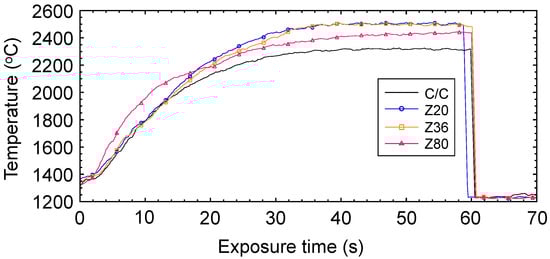 The surface-temperature profiles of the composites are shown in Figure 4. The maximum temperature reached was ~2200 °C or higher. Because the emissivity of the samples decreased due to the formation of surface oxide scales, the surface temperature was higher than the measured value. The surface temperature of the C/C used as a preform was considerably lower than those of others because oxide scales with lower thermal conductivity (ZrO2: ~2 W/m·K; TiO2: ~7–10 W/m·K [54]) were not formed on the surface. The heat flux under these test conditions was ~4.6 MW/m2, and the dynamic pressure was approximately 13 kPa, which is similar to the value reported in the literature [50]. This indicates that steady-state exposure above 2200 °C was successfully conducted in the arc-wind tunnel test for 60 s.
