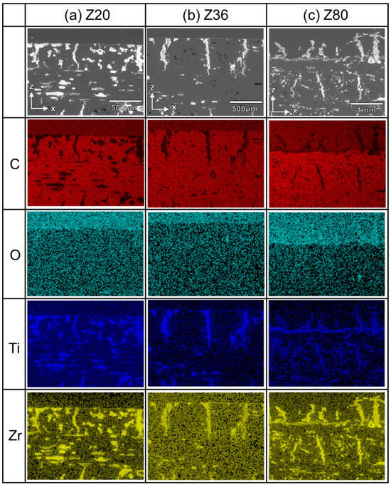 The morphologies and distributions of O, C, Zr, and Ti in the cross-section are shown in Figure 7a–c. Here, smooth surfaces with thin scales (a thickness of less than 10 μm) were observed in Z20 and Z36, whereas oxide-scale protrusion was observed in Z80. Koide et al. discussed the differences in morphologies based on the amount of ZrO2 that formed solid and porous structures on the surface at 4.6 MW/m2 [50]. The result corresponded to the XRD patterns, as the XRD peak for carbon ((002)) was more prominent for Z20 and Z36 than for Z80.