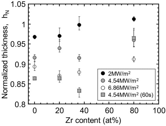 Relationship between the Zr content in the infiltrated alloy and the normalized thickness of the specimen (the circular symbols represent the plots of the test after 60 and 30 s, respectively) [50].