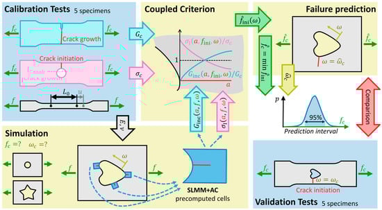 The aim of this paper is to transfer results from calibration tests to validation specimens and to correctly predict the critical load and the position of a crack initiation for the validation specimens. The predictions are then compared to the test results of the validation specimens. Figure 1 shows an overview of this procedure: The calibration tests provide the material parameters . The validation specimens are simulated using to obtain the strain fields. SLMM+AC computes and at various positions of the cavity using from the calibration tests to predict the initiation load at various positions . Next, the most critical position and the corresponding critical load are determined and a prediction interval is computed. The results of the validation tests are then compared to the predictions.