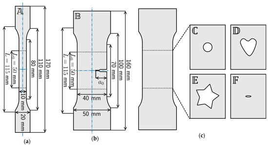 Figure 2 depicts six specimen shapes –. For each specimen shape, five samples are manufactured and tested. is the clamping length and is the region where the displacement is measured. Specimen corresponds to a multi-purpose specimen of type 1B according to the standard DIN EN ISO 527-2 [22]. Specimens – have the same outer shape of single-edge notched tension (SENT) specimens [2], with corresponding to a SENT specimen with an initial crack, and – without an initial notch and crack but with a cavity of varied shape: