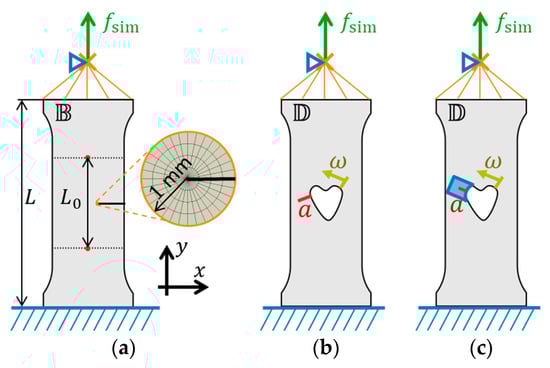Figure 3 depicts FEM models of specimens with a crack or a cavity. The models cover the clamped region with a length . A constant load is applied at the top reference point (orange cross). The models use the small strain framework and a linear elastic material defined by a Poisson’s ratio and a Young’s modulus of . The linear character allows for the scaling of the results afterward to the actual load and Young’s modulus. The Poisson’s ratio is calibrated as described in Section 2.3.3. Since the specimen thickness is small, we assume plane stress conditions.