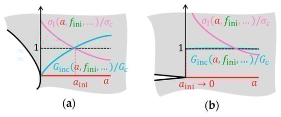 For a sharp crack, as depicted in Figure 4b, CC approaches the linear elastic fracture mechanics. At the crack tip, the stress approaches infinity; hence, the stress criterion is always fulfilled. The incremental energy release rate is constant, because, after the crack grows by some , it is still a crack with similar loading conditions. Consequently, a crack will “initiate” or grow with a very small increment . The incremental energy release rate is computed from the strain energy and approaches the energy release rate known from fracture mechanics: