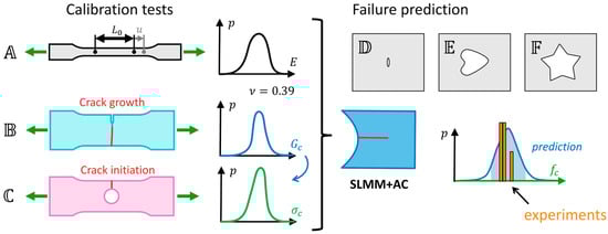 The method of the statistical analysis: Calibration tests with specimen shapes , , and provide probability functions for the Young’s modulus , fracture energy , and the critical stress . A Monte Carlo approach uses the SLMM-AC method to obtain a prediction interval of the failure load from these material parameter distributions. This prediction interval is then compared to the experimental results of the validation specimens , , and .