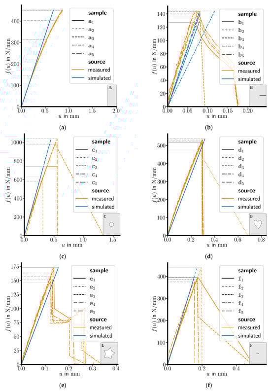Figure 6 depicts the measured load–displacement curves (orange) of all six specimen shapes with five specimens. The gray horizontal lines represent the critical force for each sample. In addition, simulated load–displacement curves are plotted as blue curves, using the specimen shapes (for specimen shape , taking into account the initial crack length of each specimen) with mean material parameters as computed from specimen shape tests, see Section 3.1. This allows for a comparison of the stiffness between experiment and simulation and the validity of using a linear-elastic material model in the simulations.