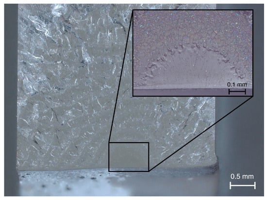Remember that our SLMM+AC approach is based on 2D models, meaning that a drop in force is associated with a crack initiation and propagation uniformly over the specimen thickness. In the experiments, however, the crack typically initiates from an initial defect and then grows radially from there. This is indicated in Figure 7 for the specimen (circular hole), which shows the fracture surface of the ligament that fractured first. The fracture surface shows initial conical markings (radial lines inside the semicircle—see figure closeup) starting from the crack initiation point. In fundamental studies of fractures in PMMA [33,34], such conical markings were correlated with PMMA fracture toughness, temperature, and loading rate. In addition, the gradient in the white areas indicating crazes in the material was explained by changes in crack-driving forces and, therefore, crack growth rates. This actual radial fracture process can explain additional scatter in the tested critical loads of the specimens and limit the transferability of material parameters calibrated for a specific specimen thickness to other thicknesses.