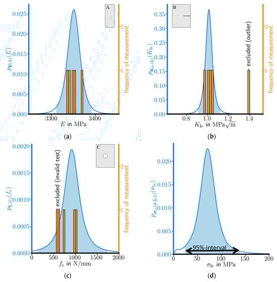 With the mean values , and listed in Table 1, the mean critical stress is computed. Furthermore, probability density functions for new realizations are plotted in Figure 8 for (a) the Young’s modulus, (b) the fracture toughness, (c) the critical load for specimen shape , and (d) the critical stress. Table 2 lists the quantiles of the probability functions. The 2.5% and 97.5% quantiles are the bounds of the 95% prediction intervals that are illustrated by a light blue filled area in Figure 8. The 95% prediction intervals in (c) and (d) are wide, because only valid tests for specimen shape are considered. The orange histograms show the measured values from Table 1, with the frequency of measurement indicating the number of samples lying in the region of the histogram bar. Since the measured Poisson’s ratio is nearly constant, we set it to a constant value .