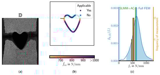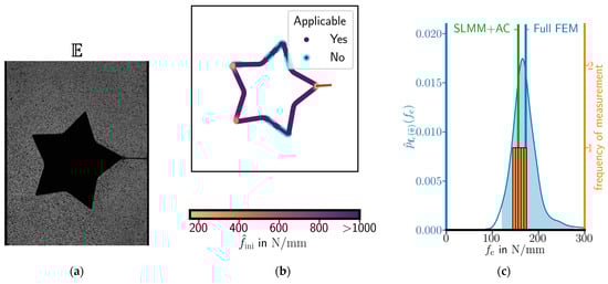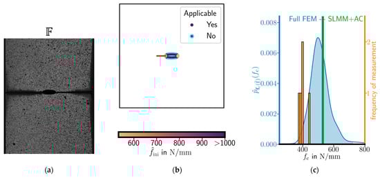To prove this hypothesis, six specimen shapes with five repetitions each were laser-cut out of a polymethyl methacrylate (PMMA) plate. Three of the shapes were used to obtain the Young’s modulus and Poisson’s ratio, the critical energy release rate, and the critical stress of the material, respectively. Further, three specimen shapes were used to validate our SLMM+AC approach by predicting the most critical position and the critical load for the validation specimens. The predictions are compared to the predictions of the Full FEM approach and the measured critical loads. To account for the scatter of material properties and possible shape variations, distributions of Young’s modulus, critical energy release rate, and critical stress are computed from the tests. With these distributions, a prediction interval for the critical load in the validation specimens is computed using a Monte Carlo (MC) method.