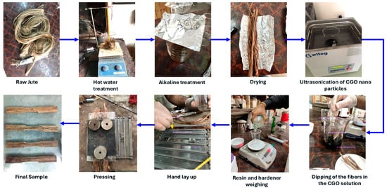 Initially, untreated jute fibers were collected and treated with hot water at 60 °C for 1.0 h and at 100 °C for 30 min to remove organic contaminants. The fibers were then dried in an oven at 80 °C for 40 min to remove any moisture. Next, 100 mL of KOH solution was prepared at concentrations of 1.0, 4.0, and 6.0 wt.%. Simultaneously, the dried fibers were cut into 20 cm long pieces, dipped into the prepared alkaline solutions for 2 h, and further oven-dried at 80 °C for 40 min. CGO was primarily in water as a solution and was subjected to ultrasonic cleaning in a sonication bath with water as a medium for 30 min to break the agglomerated CGO particles. The jute fibers were dipped for 40 min into 80 mL of CGO solution. Then, the solution with jute fibers inside was heated at 70 °C for 1.0 h to minimize CGO particle loss. Figure 1 presents the key steps during composite fabrication.