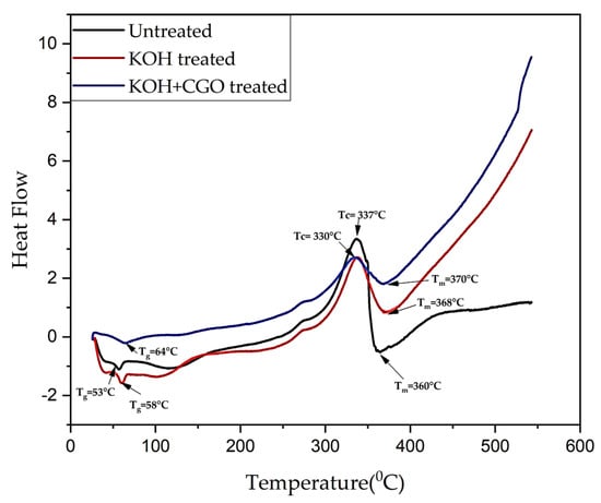 The thermal behavior of the treated and untreated fiber-reinforced polymer composites (JFRC) is displayed in Figure 3. The individual thermal deterioration characteristics of the matrix and the fibers were combined to create the overall thermal degradation pattern of epoxy resin matrix composites reinforced with untreated, alkali-, and alkali+CGO-treated jute fibers [19]. The DSC curve of the composite reinforced with untreated jute fibers showed that the transition temperature (Tg) to a soften glassy phase occurred at 53 °C, and that a modest endothermic moisture desorption peak was found. The Tg peak moved to a temperature higher than 53 °C for the untreated fiber-reinforced composite, and to 58 °C for the composite reinforced with alkali-treated jute fibers. Finally, the Tg peak moved to an even higher temperature of 64 °C for the CGO and alkali-treated jute fiber reinforced composites. The improved interfacial bonding restricted the mobility of the polymer chains near the fiber–matrix interface, resulting in a higher Tg. This could lead to a decrease in the available surface area needed for moisture desorption through a decrease in moisture evaporation [20]. In a work by Dilfi et al., the increase in the Tg was associated with the decreased mobility of the matrix chains, which was an indication of improved interfacial adhesion between the fiber and the matrix [6].