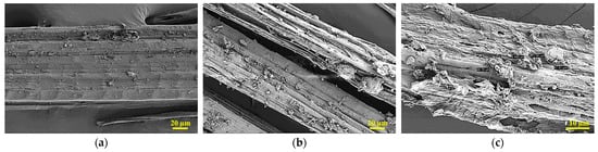 The surface morphologies of the untreated, alkali-treated, and alkali+CGO-treated jute fibers analyzed by the SEM are shown in Figure 4. The surfaces of the untreated jute fibers (Figure 4a) were smooth and multicellular in nature, whereas rough surface morphology and fragments on the surface of the alkali-treated jute fibers were observed (Figure 4b). This could be because of the removal of the cementing layer, which is composed of waxes, fats, lignin, pectin, and hemicelluloses [23]. Generally, a grooved appearance with micro-voids was visible after alkali treatment [24]. The CGO-dipped fibers showed a layer-like appearance (Figure 4c). A more uniform and evenly coated fiber surface with only a few flakes was present on the surface, which could be due to good adhesion and interlocking of the CGO particles on the fiber surface grooves [9].