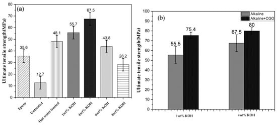 Figure 5. Tensile strength of jute fiber–reinforced epoxy composites with (a) various surface treatments and (b) 1.0 wt.% and 4.0 wt.% KOH treated JFRC after CGO addition.