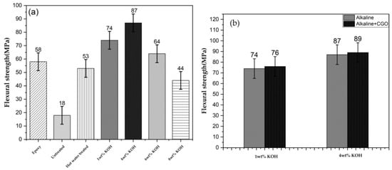 Figure 6. Flexural strength of (a) jute fiber–reinforced epoxy composites subject to various surface treatments and (b) 1.0 wt.% and 4.0 wt.% KOH treated JFRC after CGO addition.