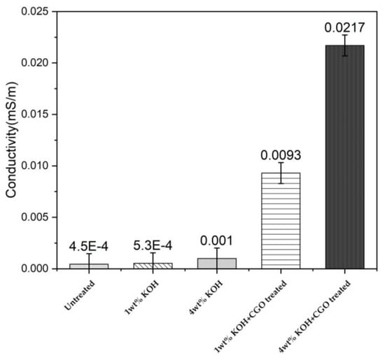 Figure 7 shows the electrical conductivity (mS/m) versus chemical surface-treated fiber epoxy composite for all specimens (untreated JFRC, 1.0 wt.% KOH-treated JFRC, 1.0 wt.% KOH+CGO-treated JFRC, 4.0 wt.% KOH, and 4.0 wt.% KOH+CGO-treated JFRC). The results revealed that the 4.0 wt.% KOH+CGO-treated JFRC had the highest electrical conductivity of 2.17 × 10−2 (mS/m), while the untreated JFRC had the lowest electrical conductivity of 4.5 × 10−4 (mS/m). The electrical conductivity of the JFRC increased significantly by approximately 123% after 4.0 wt.% alkali treatment. Further coating with CGO resulted in an increase of approximately 2070% because the electrical conductivity of CGO is very high. Figure 7 also shows that the electrical conductivity of the 4% KOH-treated JFRCs coated with CGO was greater than that of the 1% KOH-treated JFRCs coated with CGO because a high concentration of alkaline solution removes non-cellulosic nonconductive materials (lignin and hemicellulose) on a large scale [9]. This confirms the high electron flow. In addition, the highly electrically conductive CGO layer on the chemically treated surface confirmed that a high electron flow of lignin was present in the untreated jute before chemical processing.