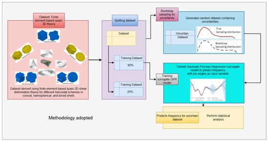 To estimate the distribution of sample statistics and generate random sampling or resampling of the data, bootstrapping is amongst the most preferred statistical methods [40]. Compared to parametric methods, such as ANOVA, no assumption is required by bootstrapping and it does not involve complex mathematical formulations [41]. Monte Carlo simulation generates samples based on the probability model and thus depends on the accuracy of the model developed [42]. From the review work on the stochasticity of the free vibration behavior of laminates, Kriging and first-order perturbation techniques are amongst the most widely used techniques for uncertainty quantification and statistical interference [43]. However, Kriging required special assumptions during its application, i.e., assumptions involved for the specific distribution of the data [44]. Also, the Kriging model necessitates fitting a variogram, which, in turn, is a complex and time-consuming exercise [45]. Considering the first-order perturbation technique, the bootstrap can handle non-linear data effectively and efficiently and can be applied to any statistical model [46,47]. The straightforwardness, effectiveness with small sample size, and lack of complex statistics are some of the other advantages of bootstrapping compared to the Kriging and first-order perturbation techniques [48,49,50]. The present work proposes the use of bootstrapping along with the Gaussian Process Regression (GPR) machine learning algorithm [51] for studying the influence of the uncertainties in the orientation of angle of layers for 20- and 28-layered bio-inspired helicoidal clamped laminated composite cylindrical, hemispherical, and toroid shells. The layup schemes adopted during the present study are presented in Table 1. For generating random samples, bootstrapping is used. The dataset for training the GPR model is obtained using higher-order shear deformation theory. For randomly generated uncertain samples, a trained GPR surrogate is used to predict the frequencies of the shells. The methodology adopted during the present study is presented in Figure 1. The present results are compared with the results obtained using the Monte Carlo simulations. The proposed methodology can effectively predict the stochastic behavior of the laminated shells without a large dataset, thus incorporating the benefits of both bootstrapping and GPR.