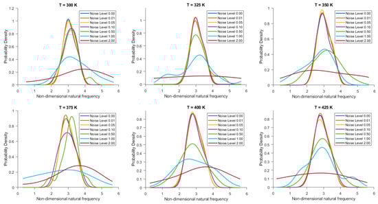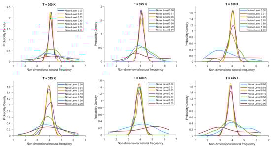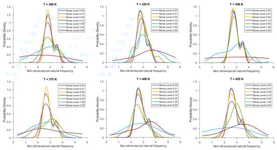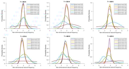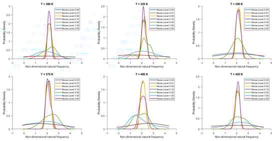 Figure 10. Probability density function of non-dimensional natural frequency for clamped 20-layered bio-inspired helicoidal laminated composite toroidal shells under thermal conditions for different levels of noise in ply orientation.