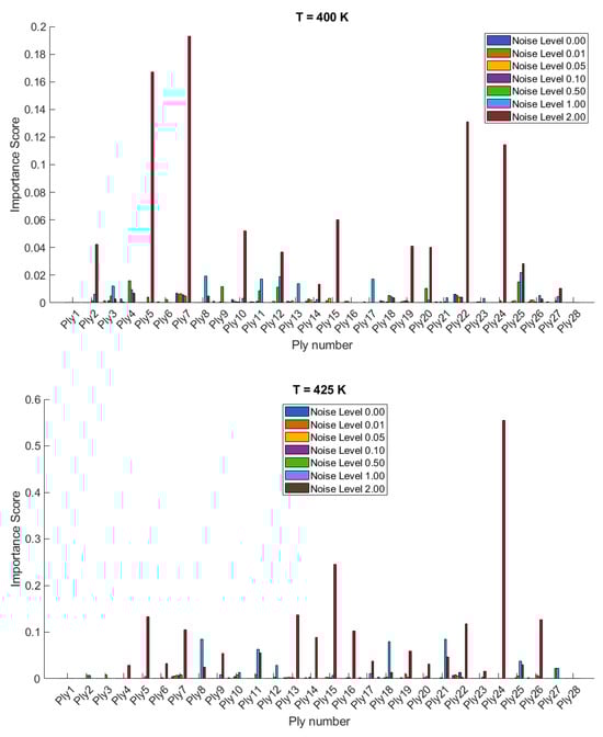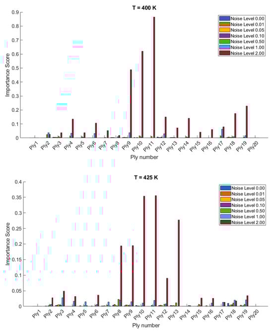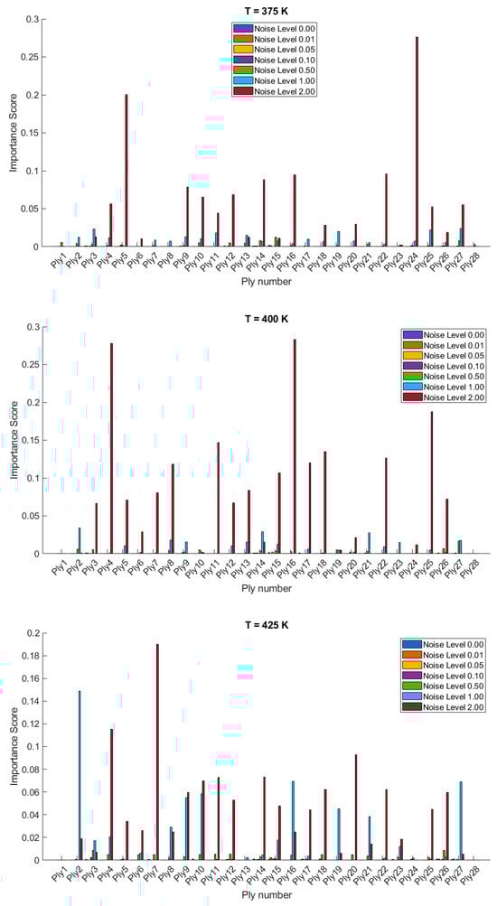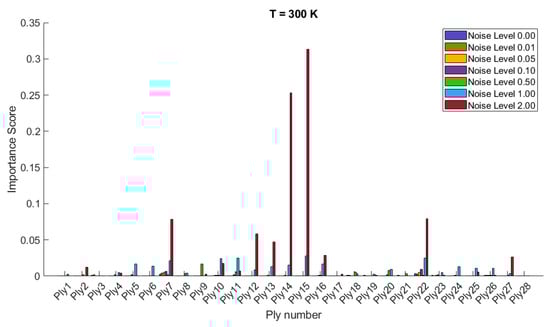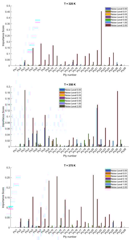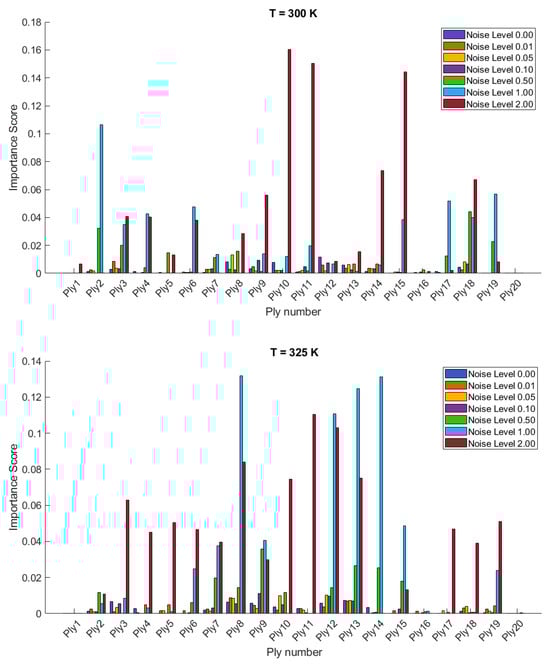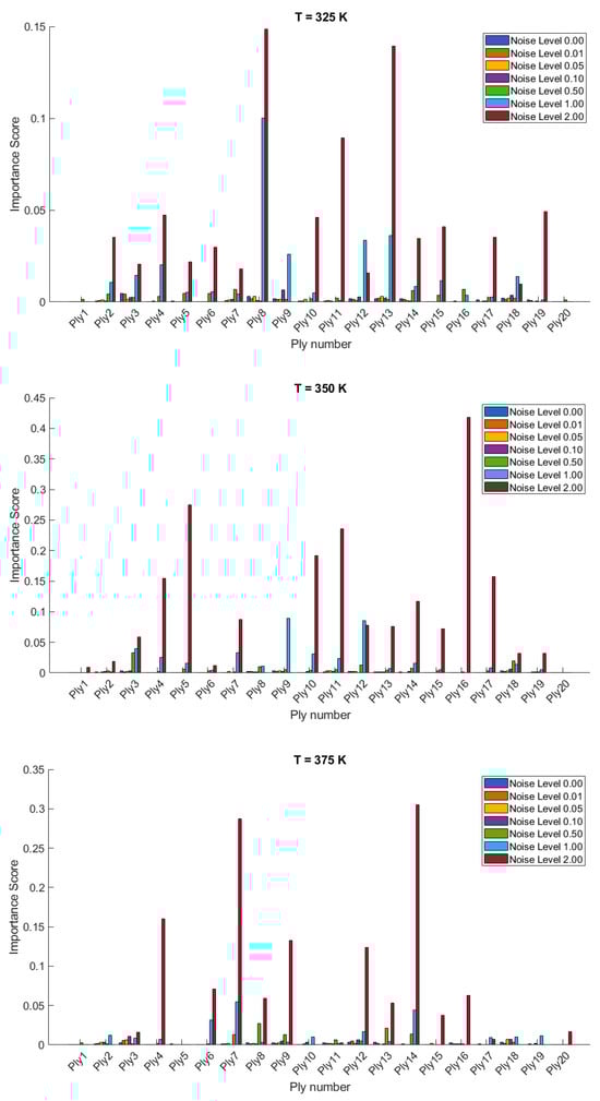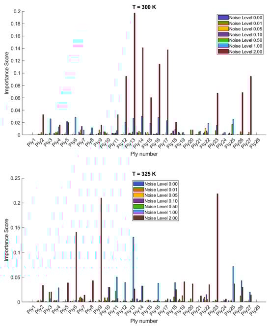 The importance scores/sensitivities for different plies vary significantly with temperature changes and are presented in Figure 4 and Figure 5 for 20- and 28-layered shells, respectively. For instance, at lower temperatures (300 K and 325 K), certain plies such as ply10 in the 20-layered and ply 17 in the 28-layered shell show higher importance scores (Figure 4). As the temperature increases to 400 K and 425 K, the importance scores for specific plies (e.g., ply 10, ply 17) become even more pronounced in the 20-layered shell, whereas the pattern is more evenly distributed among various plies in the 28-layered shell. Higher noise levels (1.00 and 2.00) consistently show higher importance scores compared to lower noise levels (0.01, 0.05, 0.10). For both shell types, the zero-noise level (Noise Level 0.00) generally shows the lowest importance scores across all plies, indicating that noise introduces variability and sensitivity in the ply orientations. In 20-layered shells, specific plies (e.g., ply 10, ply 12, ply 17) exhibit high sensitivity across all temperatures and noise levels, suggesting these plies play a critical role in the vibration behavior. In 28-layered shells, the importance scores are more distributed, but certain plies (e.g., ply 10, ply 17, ply 26) still show significant sensitivity, indicating critical plies but with a more distributed influence compared to the 20-layered shells.