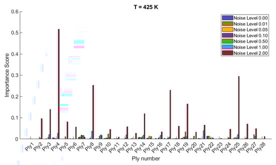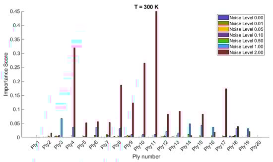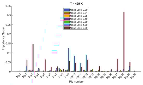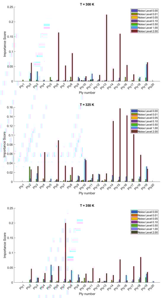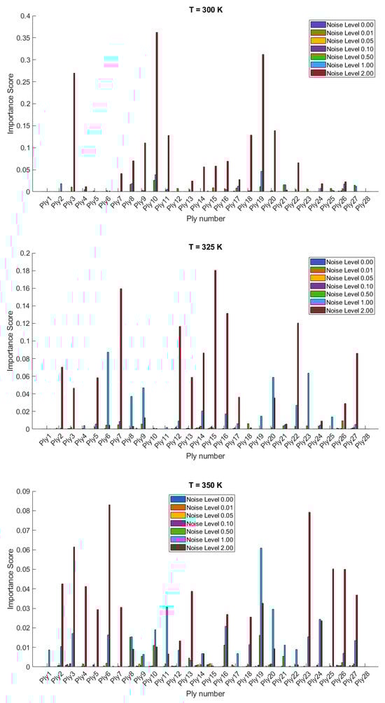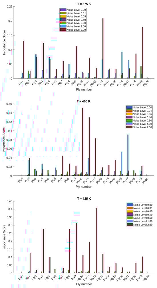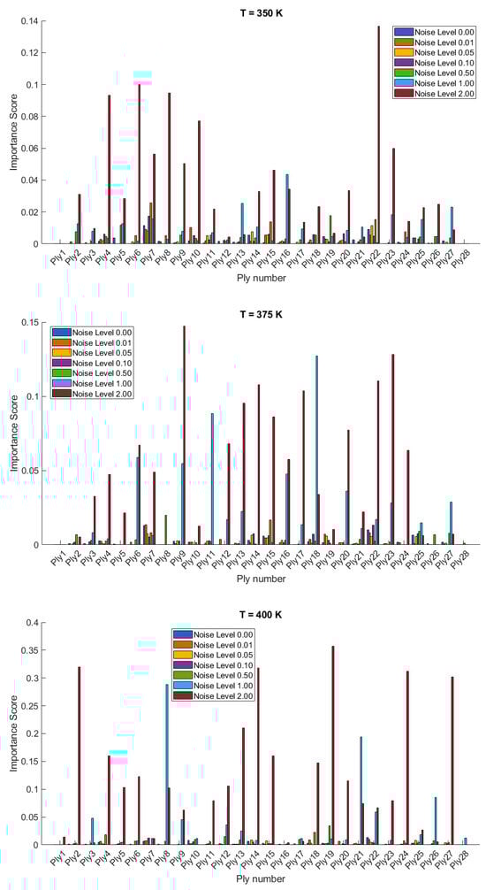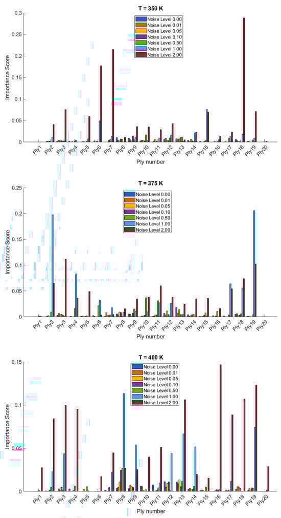 The importance scores/sensitivities for different plies vary significantly with temperature changes and are presented in Figure 4 and Figure 5 for 20- and 28-layered shells, respectively. For instance, at lower temperatures (300 K and 325 K), certain plies such as ply10 in the 20-layered and ply 17 in the 28-layered shell show higher importance scores (Figure 4). As the temperature increases to 400 K and 425 K, the importance scores for specific plies (e.g., ply 10, ply 17) become even more pronounced in the 20-layered shell, whereas the pattern is more evenly distributed among various plies in the 28-layered shell. Higher noise levels (1.00 and 2.00) consistently show higher importance scores compared to lower noise levels (0.01, 0.05, 0.10). For both shell types, the zero-noise level (Noise Level 0.00) generally shows the lowest importance scores across all plies, indicating that noise introduces variability and sensitivity in the ply orientations. In 20-layered shells, specific plies (e.g., ply 10, ply 12, ply 17) exhibit high sensitivity across all temperatures and noise levels, suggesting these plies play a critical role in the vibration behavior. In 28-layered shells, the importance scores are more distributed, but certain plies (e.g., ply 10, ply 17, ply 26) still show significant sensitivity, indicating critical plies but with a more distributed influence compared to the 20-layered shells.