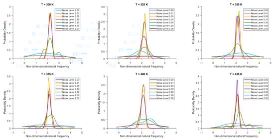 Figure 3. The probability density function of non-dimensional natural frequency for clamped 28-layered bio-inspired helicoidal laminated composite conical shells under thermal conditions for different levels of noise in ply orientation.