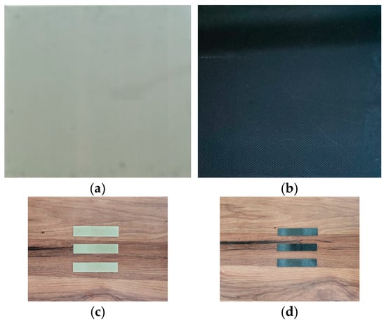GFRP (a) and CFRP (b) sheet plates. Model of GFRP (c) and CFRP (d) test specimens.