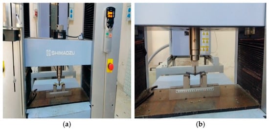 The three-point bending test was carried out in Shimadzu AG-X (Shimadzu, Kyoto, Japan) with a loading capacity of 100 kN and a speed of 1 mm/min by attaching the appropriate bending tip apparatus to the tensile tester. According to TS EN ISO 14125, the force was applied to the center of a flat specimen on two supports with circular or rectangular cross-sections [18]. As seen in Figure 6, the F force was applied perpendicularly to the sample and the aim was for the fracture to occur in the middle of the sample. During this process, the maximum compressive force occurred at the top of the sample and the maximum tensile force occurred at the bottom. The bending process continued until the piece broke.