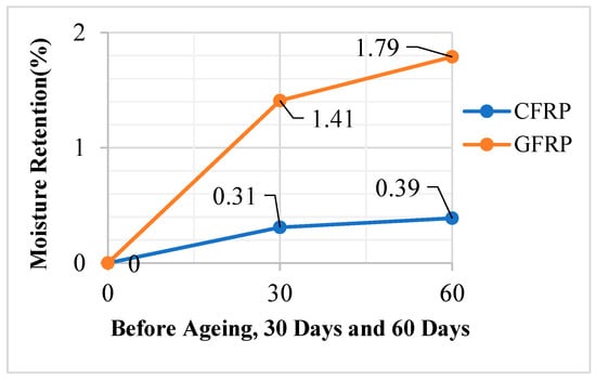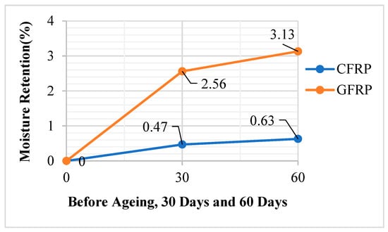 According to the results of three-point bending tests in Figure 7, the moisture retention rate (%) of the GFRP samples kept in seawater for 30 days was found to be 1.41 and the moisture retention rate (%) of the GFRP samples kept in seawater for 60 days was found to be 1.79. The moisture retention rate (%) of the CFRP samples kept in seawater for 30 days was found to be 0.31 and the moisture retention rate (%) of the CFRP samples kept in seawater for 60 days was found to be 0.39.
