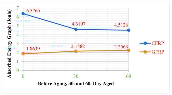 In Figure 10, the highest increase in the amount of absorbed energy in the GFRP composite samples was determined at 30 days after soaking in seawater. After 60 days of aging, the absorbed energy is 2.2563 J in the CFRP and 4.5123 J in the GFRP composites. When the GFRP samples are impacted, they can delay fracture or slow down crack propagation by absorbing energy. This shows that the GFRP samples are more ductile than CFRP, but the CFRP samples are more durable and harder [5].