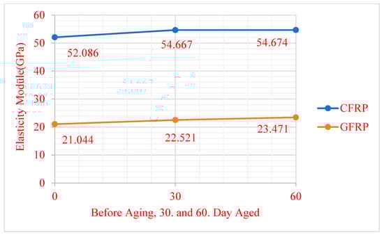 In the three-point bending test, the difference between the elasticity module of the CFRPs before aging and the 30-day-aged samples was observed as 4.417 GPa, and the difference between the elasticity module of the CFRP 30-day-aged and 60-day-aged samples was seen as −0.0047 GPa. On the other hand, the elasticity module of the GFRPs before aging and 30-day-aged samples was observed at −1.4763 GPa, and the difference between the elasticity module of the GFRPs 30-day-aged and 60-day-aged samples was seen as -0.9504 GPa. The difference between the before-aged and 60 day-aged CFRP samples was 4.412 GPa and the difference between the before-aged and 60 day-aged GFRP samples was −2.426 GPa, so it is seen that the elasticity module of the CFRP sample was higher. The modulus of elasticity is a fundamental mechanical property that indicates how much a material deforms under applied stress [21]. The high modulus of elasticity of CFRP means that the material stretches very little under load and provides high rigidity. Thanks to the high modulus of elasticity, the CFRP samples showed minimum deformation.
