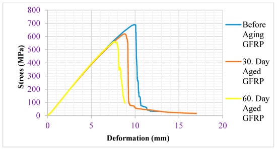 In the before-aging GFRP composite sample, plastic deformation started at a speed of 9.883 mm/min, a force of 0.905 kN, an elongation of 9.884 mm, and a maximum stress of 689.946 MPa. After 30 days, plastic deformation started in the aged GFRP composite sample at a speed of 8.755 mm/min, a force of 0.722 kN, an elongation of 8.7555 mm, and a maximum stress of 619.947 MPa. In the GFRP sample aged after 60 days, it was observed that plastic deformation started at a speed of 7.6 mm/min, a force of 0.698 kN, an elongation of 7.6006 mm, and a maximum stress of 560.815 MPa. The stress and deformation graphs of the GRFP bending specimens aged before, after 30 days, and after 60 days are shown in Figure 13.