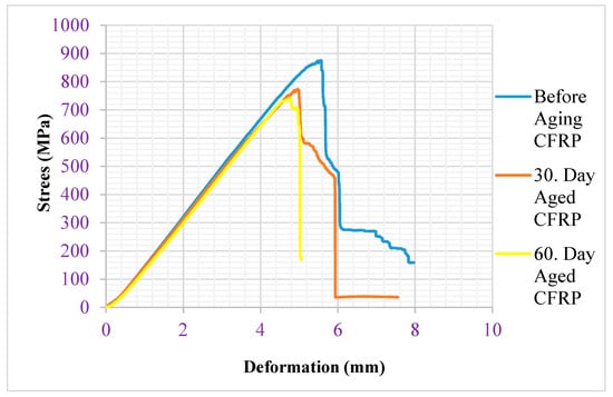 In the before-aging CFRP composite specimen, plastic deformation started at a speed of 5.558 mm/min, a force of 0.692 kN, an elongation of 5.558 mm, and a maximum stress of 875.298 MPa. After 30 days, plastic deformation started in the aged CFRP composite specimen at a speed of 4.957 mm/min, a force of 0.711 kN, an elongation of 4.9573 mm, and a maximum stress of 773.544 MPa. In the CFRP composite specimen aged after 60 days, plastic deformation started at a speed of 4.762 mm/min, a force of 0.637 kN, an elongation of 4.7622 mm, and a maximum stress of 741.844 MPa. Since the effect in the first month of the samples’ soaking time in seawater is greater than the effect in the last month, the deformation rate was also affected in the same way. The aged stress and strain graphs of the CFRP bending specimens before, after 30 days, and after 60 days are shown in Figure 14.
