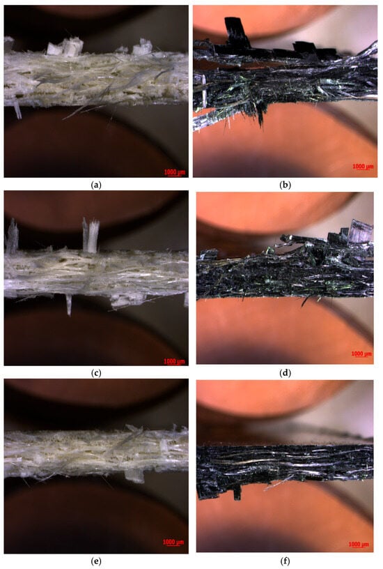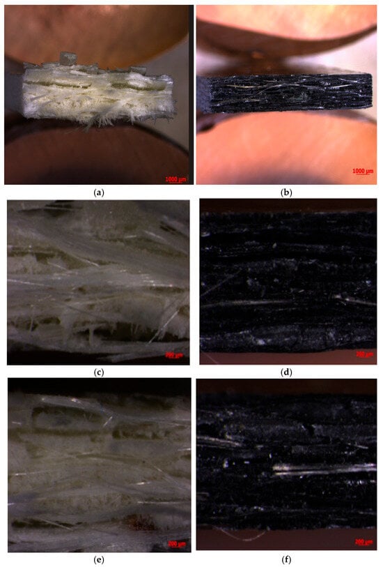 Microscopic images of GFRP and CFRP composite materials after three-point bending test. (a) GFRP before aging; (b) CFRP before aging; (c) GFRP 30 days; (d) CFRP 30 days; (e) GFRP 60 days; (f) CFRP 60 days.
