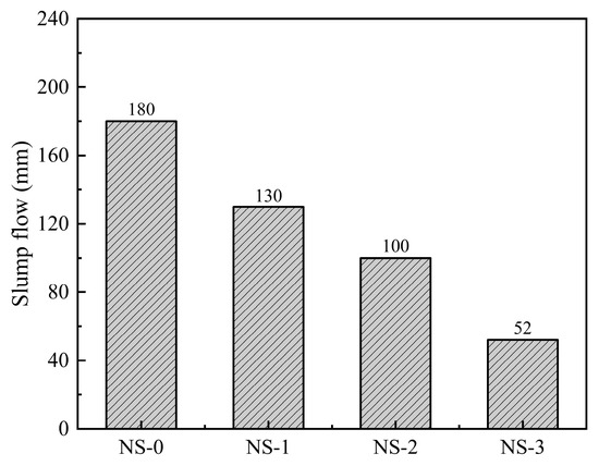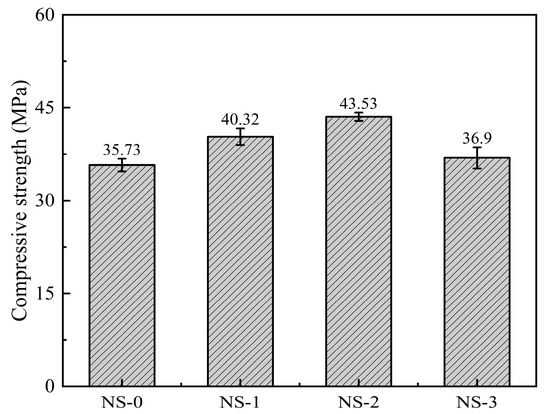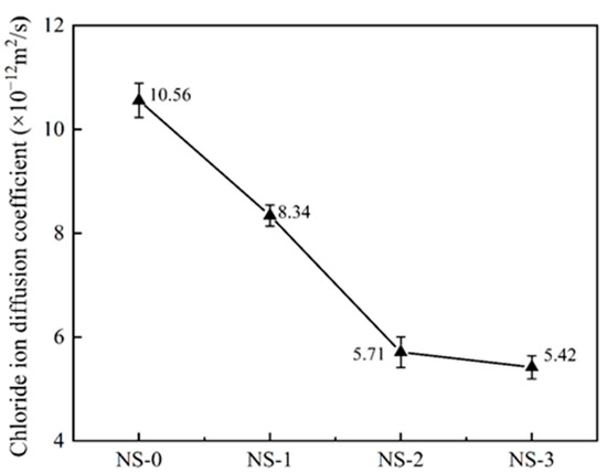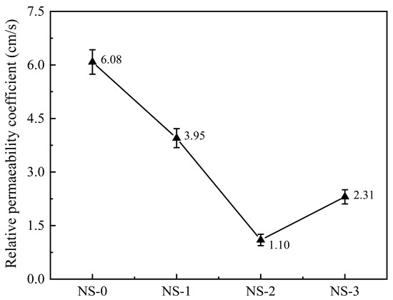- The addition of NS can improve the 28 d compressive strength, water permeability, water absorption, and chloride ion permeability of concrete. The strength of concrete specimens with 2% NS shows a 21.9% increase in strength, a 21.0% reduction in the chloride ion permeability coefficient, a 35.0% decrease in the relative permeability coefficient, and an 8.8% uction in water absorption. A higher dosage of NS can lead to agglomeration, resulting in degraded performance. Considering both mechanical properties and impermeability, it is recommended that the suitable dosage of NS is 2%.