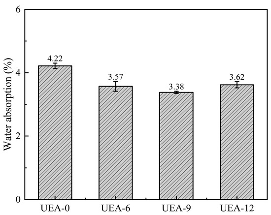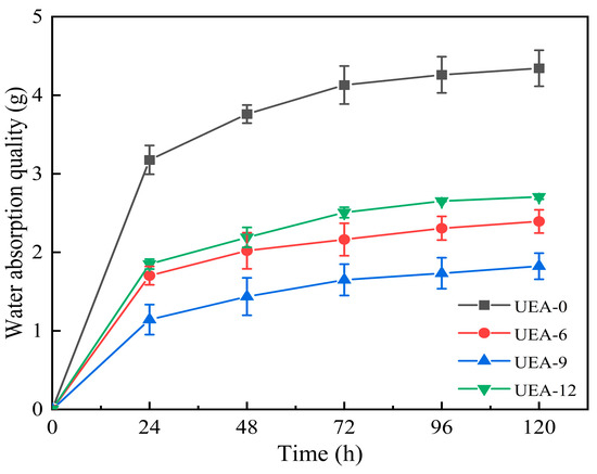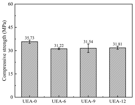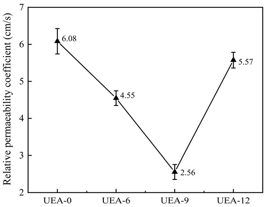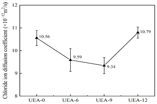 - The addition of an expansive agent reduces the 28-day compressive strength of concrete; however, an appropriate amount of expansive agent can improve the concrete’s resistance to water and chloride ion penetration as well as reduce its water absorption. When the UEA expansive agent content is 9%, the concrete’s relative permeability coefficient, chloride ion permeability coefficient, and water absorption improve by 58%, 11%, and 20%, respectively.