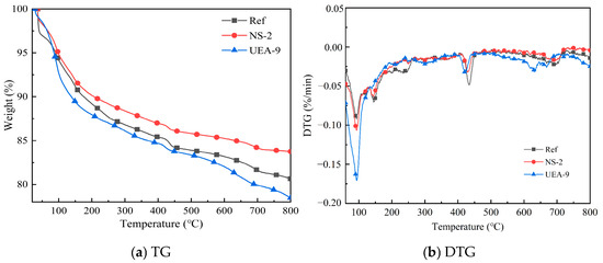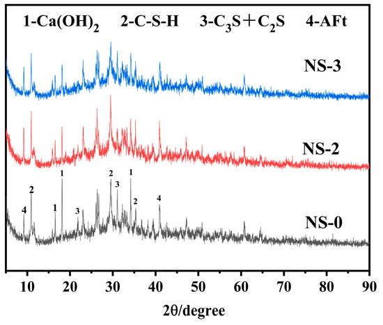 - NS exhibits excellent pozzolanic activity, reacting with the primary hydration product Ca(OH)2 to form C-S-H gel. The physical filling effect and secondary hydration reaction of NS significantly refine the pore structure of the concrete, improving both its mechanical and impermeability properties. According to the TG test results, the addition of NS enhances the thermal stability of concrete.