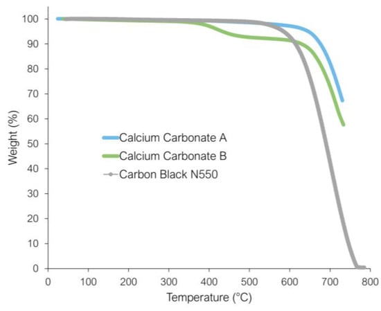 The TGA graphs are presented in Figure 2. The carbon black’s TGA shows the start of the weight loss at approximately 500 °C; the weight loss observed up to 800 °C equals 0% because of a complete thermo-oxidative decomposition of CB particles in the oxidative atmosphere of synthetic air. The onset temperature of the decomposition is significantly higher for CB than for CCB. This is most likely caused by the much more regular chemical structure of CB in comparison to the cellulose-originated biochar present on the calcium carbonate surface. The calcium carbonates A and B exhibit decomposition above 600 °C, which is the breakdown of the inorganic CaCO3 into CaO (solid) and CO2 (gas), resulting in weight loss. However, weight loss is also observed above 350 °C. This weight loss is an indication of the decomposition of organic matter or other impurities. It is evident that the fillers are composed of more than only one constituent.