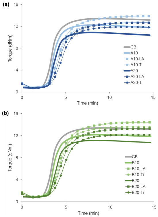 Vulcanization curves of compounds filled with calcium carbonate (a) A and (b) B.