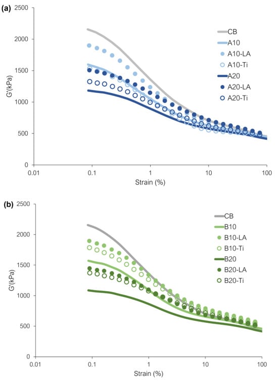 The Payne effect gives an indication of the filler–filler network strength within a compound. This parameter is usually correlated with the micro-dispersion of the filler. It is calculated as the difference between the storage modulus at low strain and at high strain. The Payne effect curves are displayed in Figure 5. It is visible that the filler–filler and polymer–filler interactions decrease when introducing the lower surface area calcium carbonates A and B, and the decrease is higher when increasing the calcium carbonate amount (A20 and B20). The addition of alpha-lipoic acid leads to a significant increase in the Payne effect of all compounds. Heat-induced disulfide exchange reactions during mixing or curing may be a cause of network formation between the fillers, increasing the filler–filler interaction [23]. As well as physically or chemically bonding to the calcium carbonate surface, the polar carboxylic group on alpha-lipoic acid might be reactive towards carbon black’s polar surface groups through van der Waals forces or hydrogen bonding, increasing the filler–filler interaction even more. These results are in agreement with the ones obtained in the vulcanization test. The introduction of the titanate coupling agent has a much lower impact on the Payne effect. For calcium carbonate A, the values obtained with the compounds in which titanate are used are similar to the ones without a coupling agent. For calcium carbonate B, the filler–filler interactions slightly increase with the addition of this coupling agent but in a lower extent than for the alpha-lipoic acid.