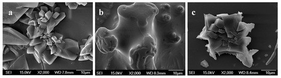 SEM images of TPP nanostructures upon evaporation from THF (1 mg/mL) on different glass substrates at 25 °C: (a) on NaPO3 glass, (b) on AgPO3 glass and (c) on SiO2 glass.