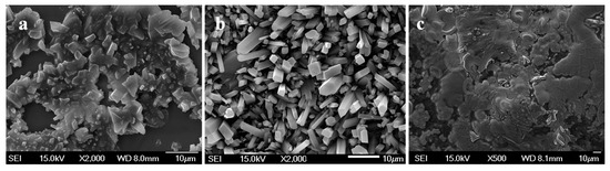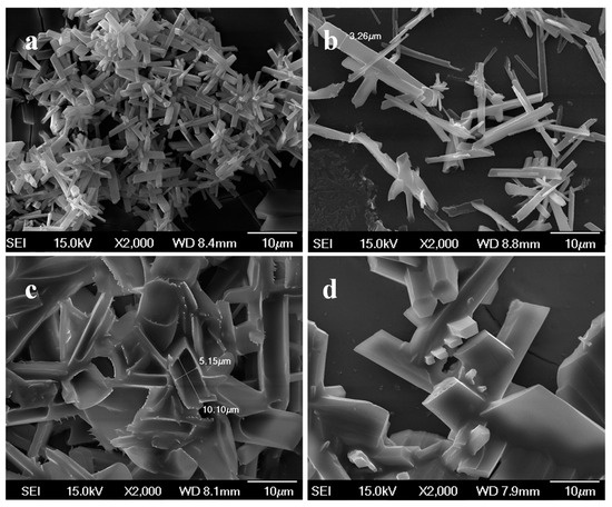 In an effort to further support this finding, we investigated the influence of two additional substrates with a significantly different surface tension compared to NaPO3, namely Si substrate and FTO-coated glass [43,44,45,46]. As depicted in Figure S1, the obtained nanostructures (sticks and tubes) exhibited a similar morphology to those presented in Figure 3. The only difference was the substrate on which the templated nucleation and growth process initiated. Since the substrates utilized in this work have different surface tensions ranging between 0.1 and 1.2 J/m2 [45,47], we conclude that this factor plays a less significant role in determining the resulting morphology, compared to the solvent and the temperature during drop-casting. Additionally, we present the statistical size distribution of the rectangular sticks obtained in three different cases through the histogram in Figure S2.