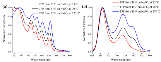 Normalized UV–Vis absorption spectra (a), and fluorescence emission spectra (b), of TPP nanostructures upon evaporation from THF (1 mg/mL) on NaPO3 glass substrate at different temperatures.