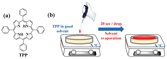 (a) Chemical structure of TPP porphyrin molecule, (b) schematic representation of the single-solvent nucleation and growth protocol for the organization of TPP on different glass substrates and at different temperatures.